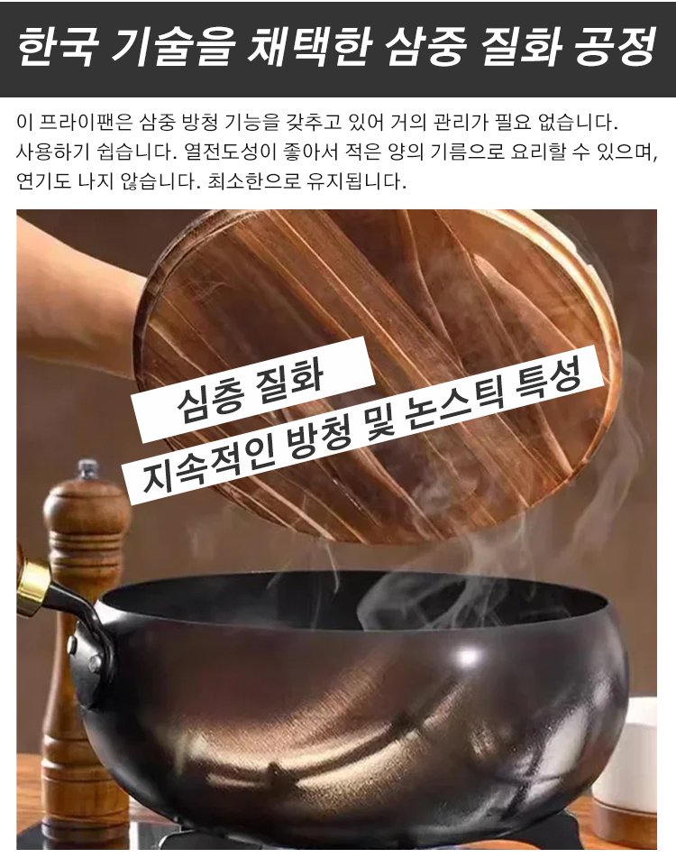 코팅되지 않은 논스틱 팬으로 더 건강하게 요리하세요. 비물질문화유산 제조 기술로 만들어져 수명이 50년까지 지속됩니다.식품접촉물질 안전기준을 준수하며, KC인증을 취득하였습니다.